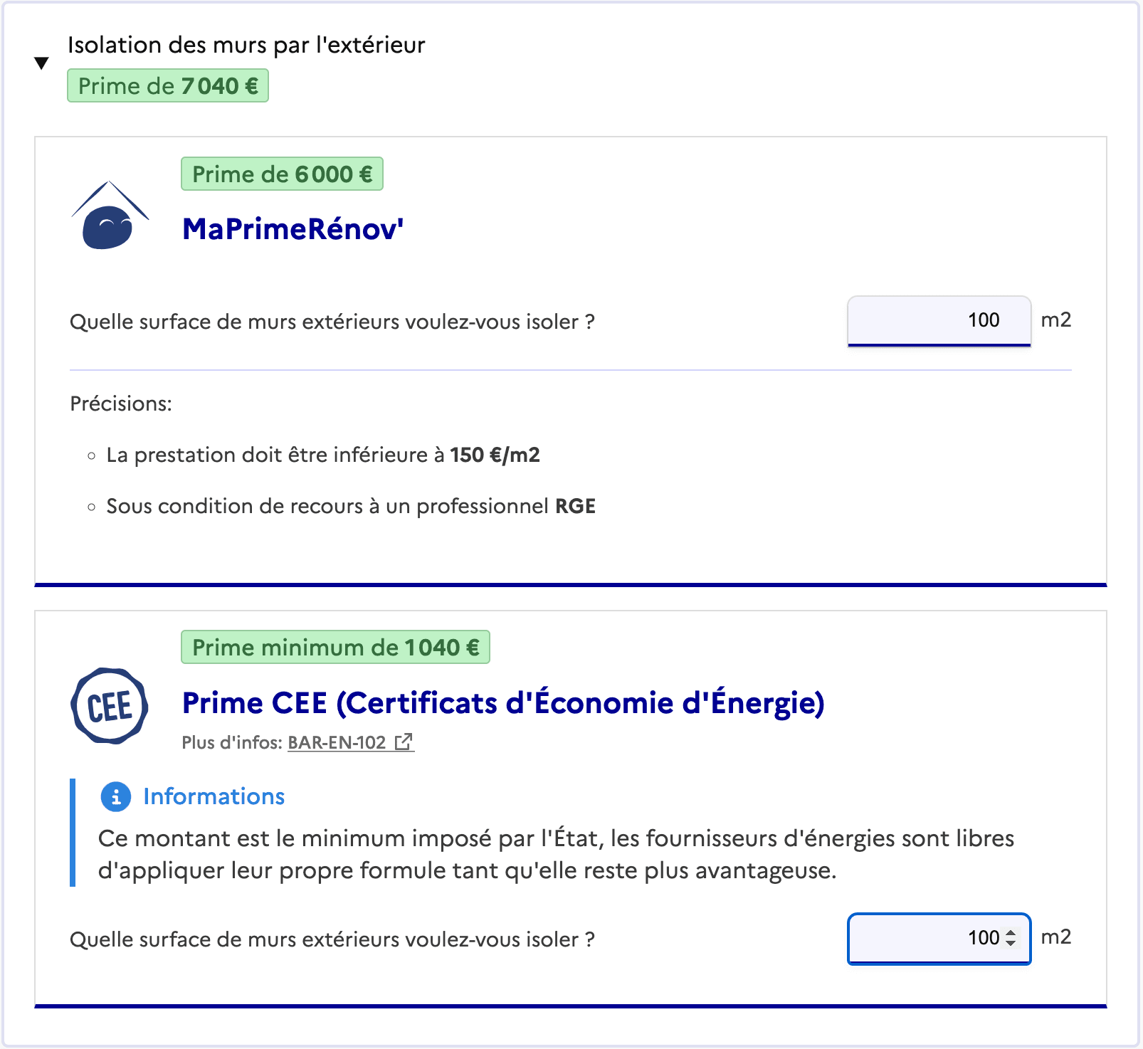 • Pour une l’isolation thermique par l’extérieur d’une maison, ce foyer peut toucher une prime CEE de 1040€ environ, en plus des 6000€ de MaPrimeRénov’.