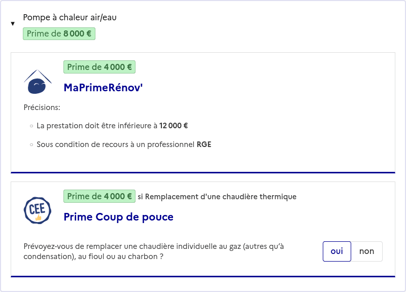 • Pour l’installation d’une pompe à chaleur air/eau, ce foyer a droit à une prime "Coup de Pouce" de 4000€, en plus des 4000€ de MaPrimeRénov’.